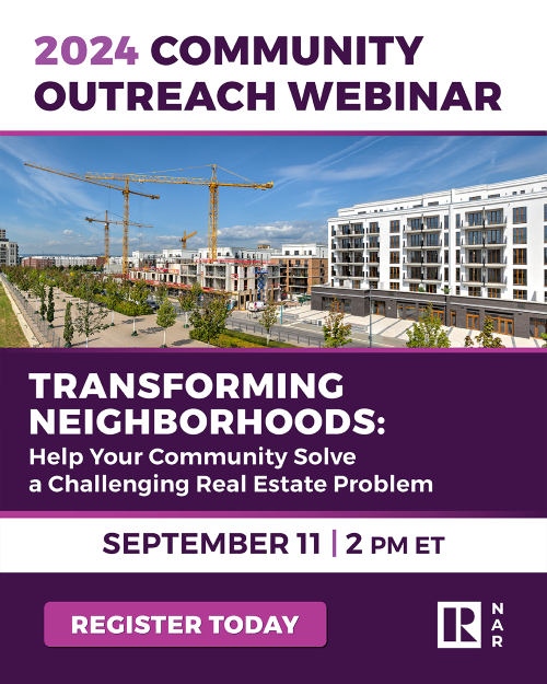 Join our webinar “Transforming Neighborhoods: Help Your Community Solve a Challenging Real Estate Problem” on September 11 at 2 PM ET. Learn how NAR’s partnership with CRE Consulting Corps can help tackle disinvestment, housing gaps, and more. Discover grant opportunities and learn about the application process.