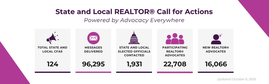 Advocacy Everywhere helps expand REALTOR® influence on public policy and boosts engagement in Calls for Action at all levels. In 2025 so far: