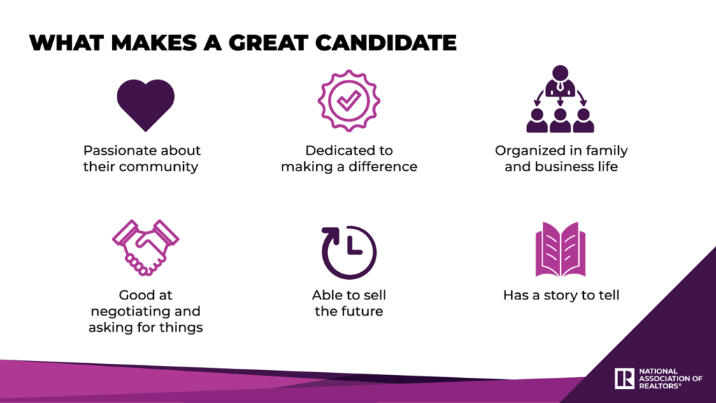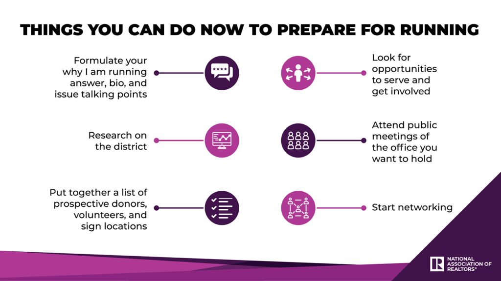 In 2020, NAR hosted a free virtual candidate training for members interested in running for state and local office. Click on the PowerPoint slides at the bottom of this page to view the recordings of this 4-part training.