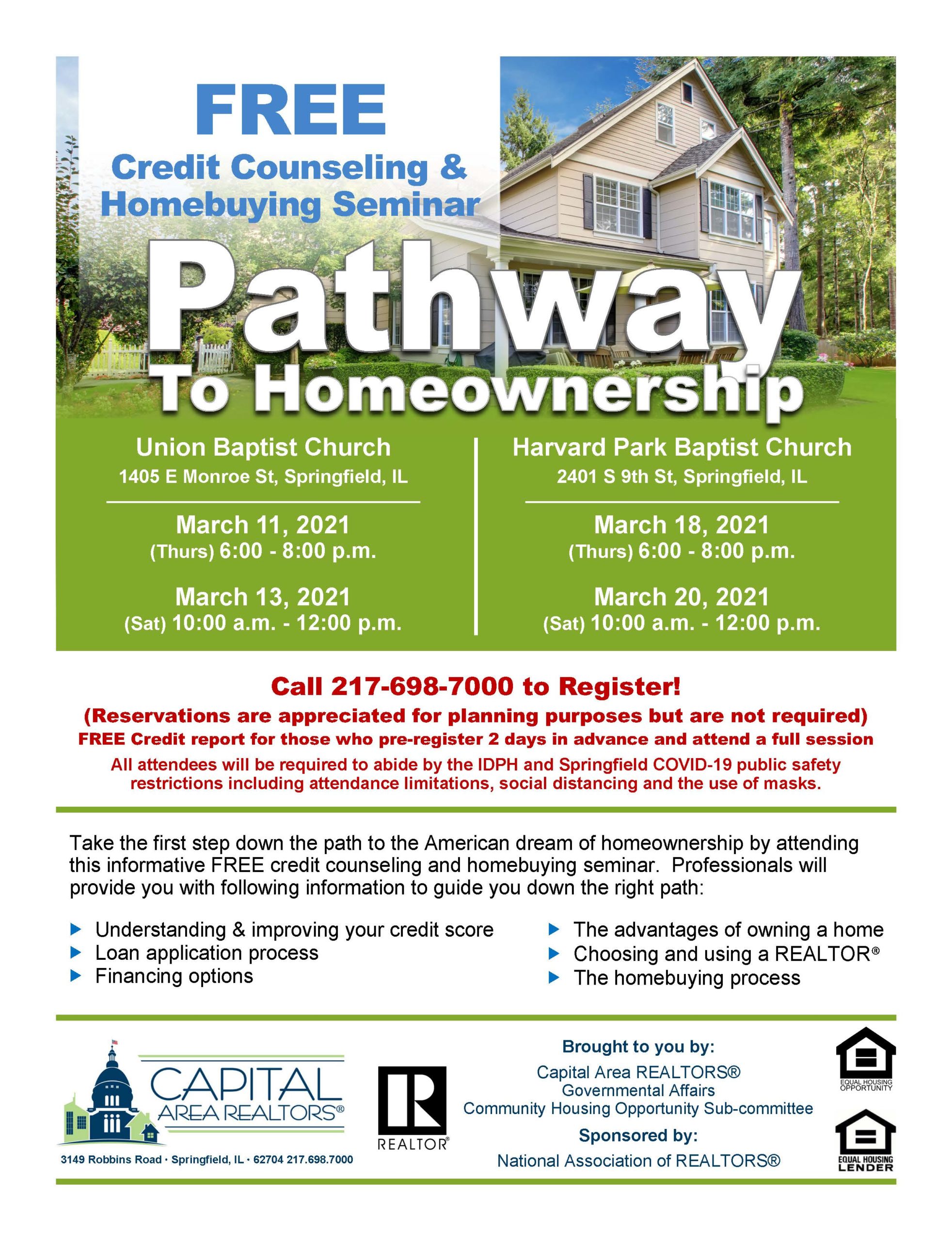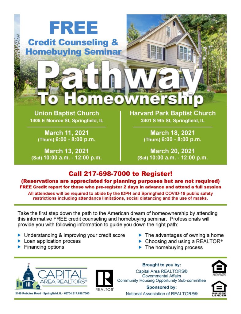 Meanwhile, in Springfield, Illinois, the Capital Area REALTORS® hosted four ‘Pathway to Homeownership’ seminars in March 2021, in person, in compliance with Covid-19 protocols, and with an emphasis on creating comfortable settings for aspiring homeowners. The events took place in two different church halls in two different disadvantaged neighborhoods that have lots of rental units – and affordable housing stock. In total, about 50 participants heard from a credit counselor, a lender, and a REALTOR® about understanding and improving credit scores, the loan application process, financing options, the advantages of owning a home, and the advantages of using a REALTOR. Those who registered in advance were offered free credit counseling, and follow-up indicated that many contacted lenders in the ensuing days to investigate their qualification.