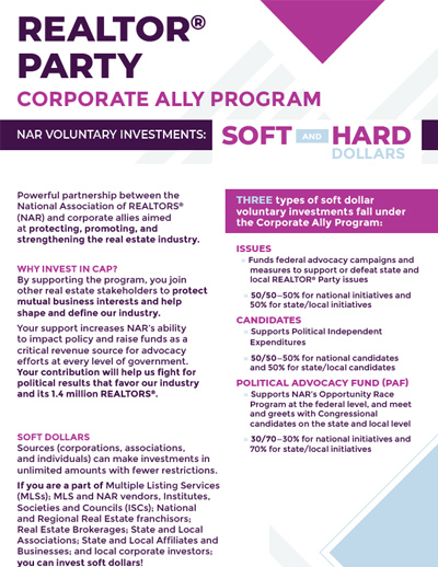 NAR’s REALTOR® Party initiative includes the REALTORS® Political Action Committee (RPAC) providing the hard dollars the association uses to make direct contributions to national, state, and local candidates, as well as the Corporate Ally Program, which provides soft money to support advocacy campaigns and public policy priorities at every level of government.