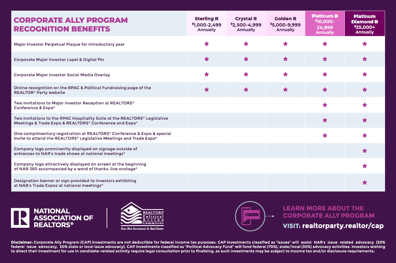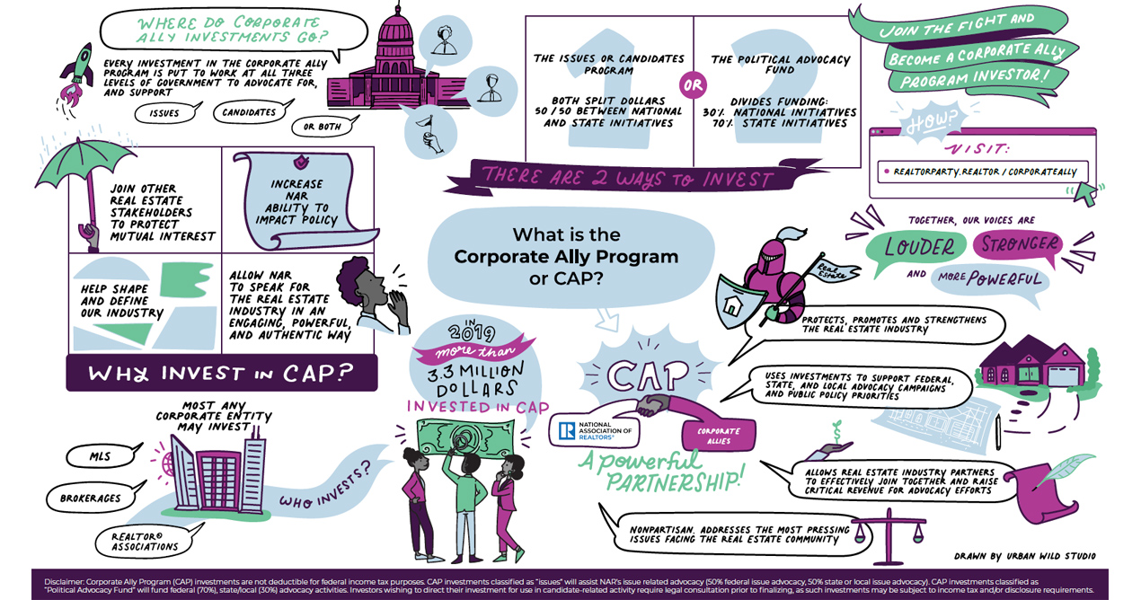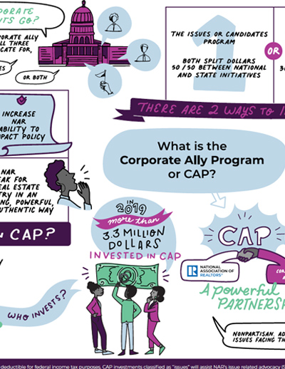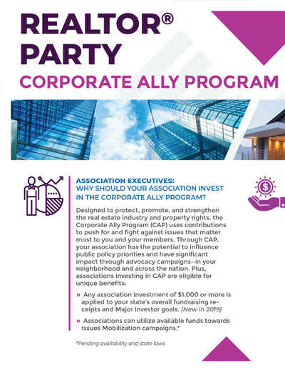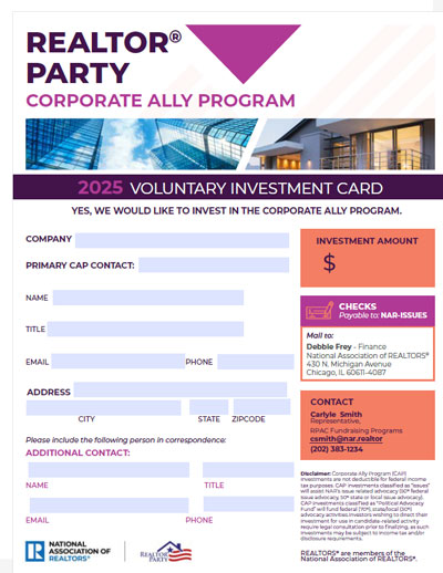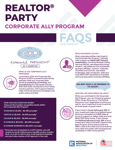 Disclaimer: Corporate Ally Program (CAP) investments are not deductible for federal income tax purposes. CAP investments classified as “issues” will assist NAR’s issue related advocacy (50% federal issue advocacy, 50% state or local issue advocacy). CAP investments classified as “Political Advocacy Fund” will fund federal (70%), state/local (30%) advocacy activities. Investors wishing to direct their investment for use in candidate-related activity require legal consultation prior to finalizing, as such investments may be subject to income tax and/or disclosure requirements.