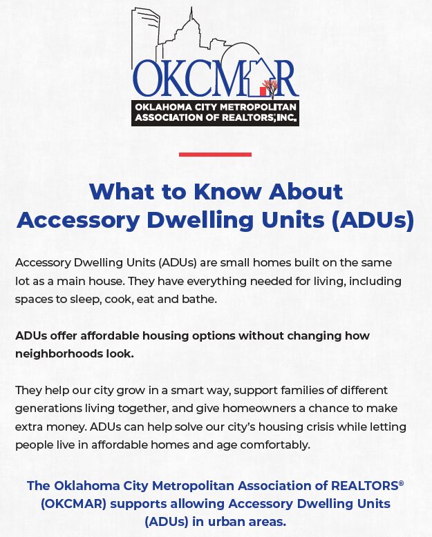 Over the course of the year, OKCMAR used the content of the LUI memos “All the different ways you can communicate,” says Government Affairs Specialist Landry Willis. “You name it: talking points for direct advocacy with members of the City Council; a flyer explaining the benefits and dispelling misconceptions about ADUS; and as the basis of an editorial by our president in The Oklahoman prior to the council’s final vote.”