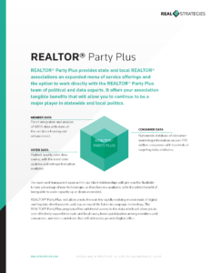 The REALTOR® Party Plus program offers associations a direct, independent business relationship with REAL Strategies, NAR’s campaign services consultant, that builds upon the data driven services currently provided to NAR through the REALTOR® Party. REALTOR® Party Plus provides state and local REALTOR® Associations with greater access to member, consumer and political data as well as state-of-the-art outreach services with the goal of enhancing REALTOR® member engagement, advocacy and consumer outreach objectives.