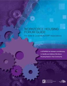 The Workforce Housing Forum Guide: A Strategy for Outreach and Advocacy outlines how to plan and conduct a workforce housing forum to identify and develop strategies to address a community’s workforce housing needs. The guide includes tips and tools for setting goals,and resources to identify partners, select speakers, manage resources and more, along with examples of successful forums conducted by REALTOR® Associations.